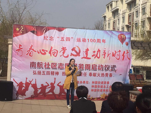 活动分为南航社区党委为社区志愿者服务团队授旗、社区的长春好人进行事迹分享、青年志愿者代表宣读倡议书,随后在小区广场组织开展志愿服务。