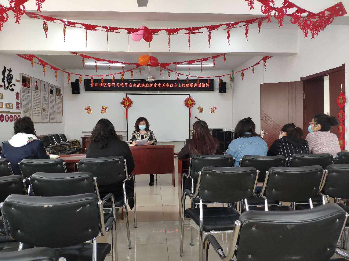 5月8日,青川社区召开会议,传达学习习近平在决战决胜脱贫攻坚座谈会上的重要讲话精神,不忘初心、牢记使命,坚定信心、顽强奋斗,抓紧落实党中央决策部署,坚决克服新冠肺炎疫情影响,研究贯彻落实举措。坚决夺取脱贫攻坚战全面胜利。青川社区党委书记主持会议并讲话。