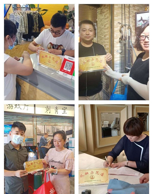 社区工作者与辖区内参与双拥示范街活动的商户签订《南关区双拥商业街服务公约》,并为商户发放“双拥示范店”牌!
